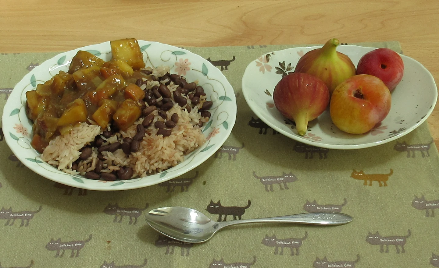 右の皿にはイチジクとプラムを乗せてあるが、これは自宅の庭で収穫したものである。