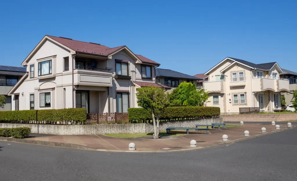 左の家屋の外壁は淡いピンク色であるが、彩度が低い。