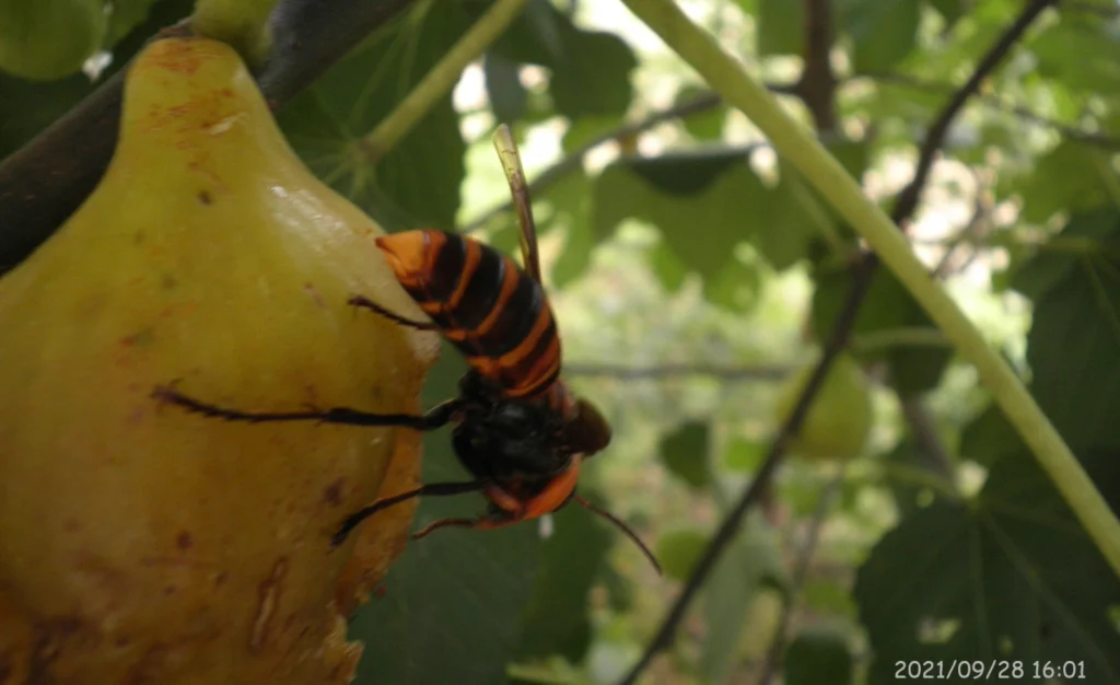 「キイロスズメバチ」が熟した個体を狙って寄ってくることがある。