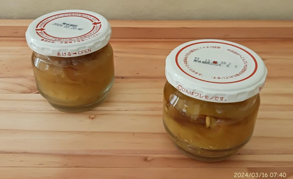 左側の瓶とは違い、汁が白濁しており、蓋の中央が膨らんでいる。