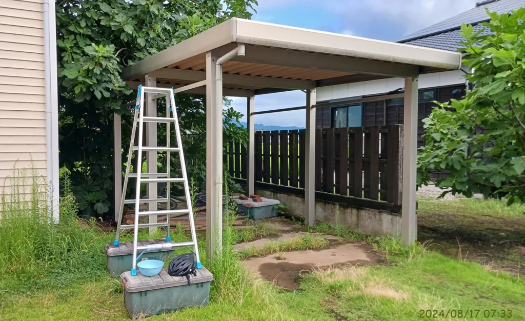 自転車用ヘルメットを被り、脚立を使って屋根の上に登った。