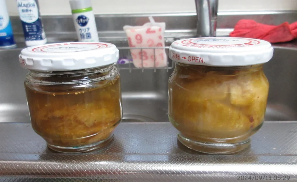 食べきれない分は瓶詰めにして内部を加熱殺菌することで、長期間常温で保存できる。