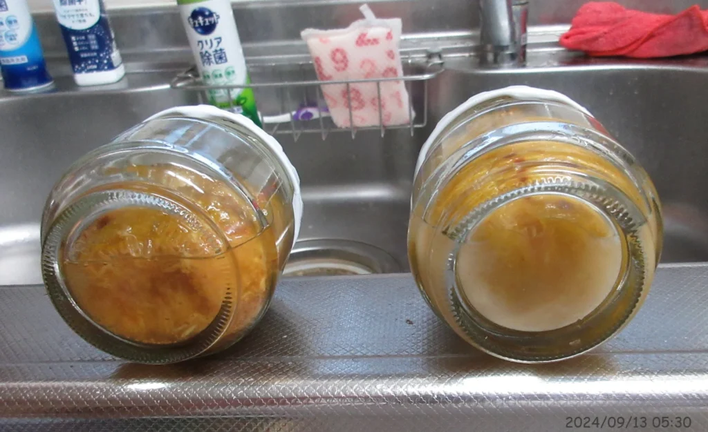 一方、右側の瓶には蓋の部分に隙間があり、中身が腐敗してしまっている。