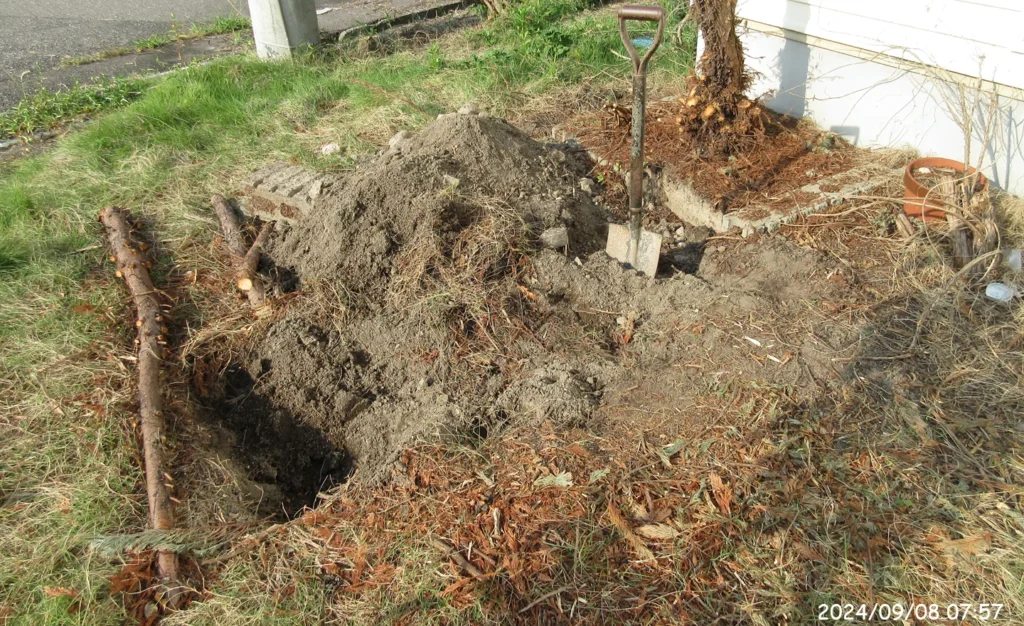 新しい苗木を植え付ける場所の周辺を掘り返し、瓦礫を取り除く。