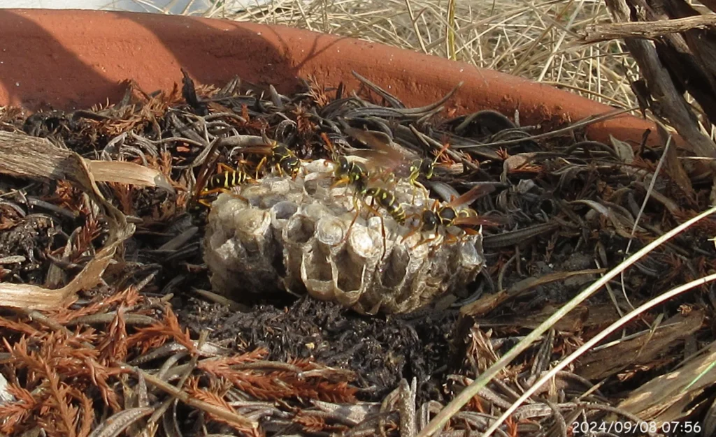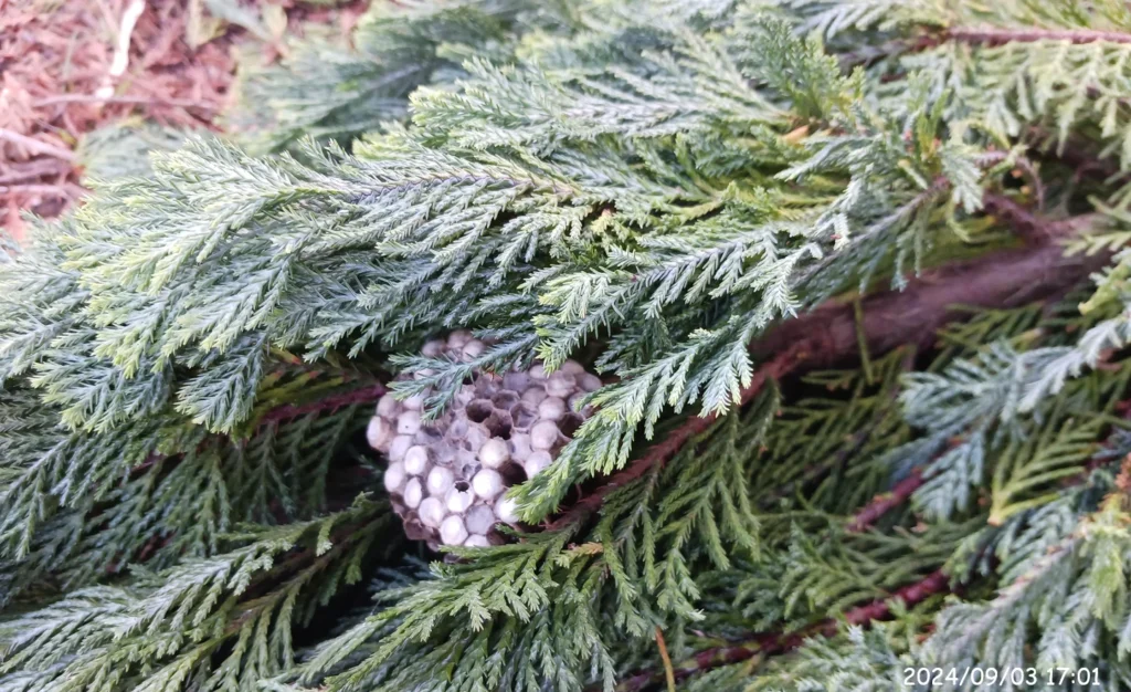 コニファーを伐採していると、アシナガバチの巣を発見。