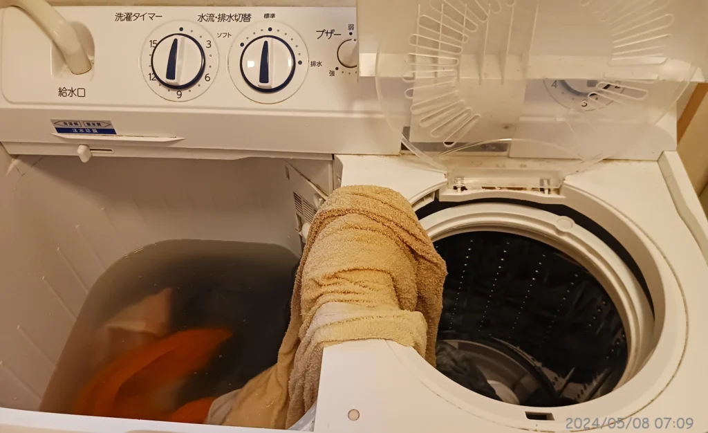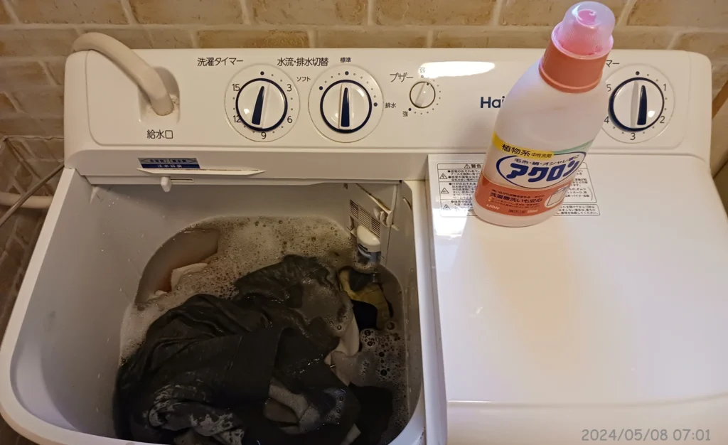 1.洗濯槽に水と洗剤、洗濯物を入れる。