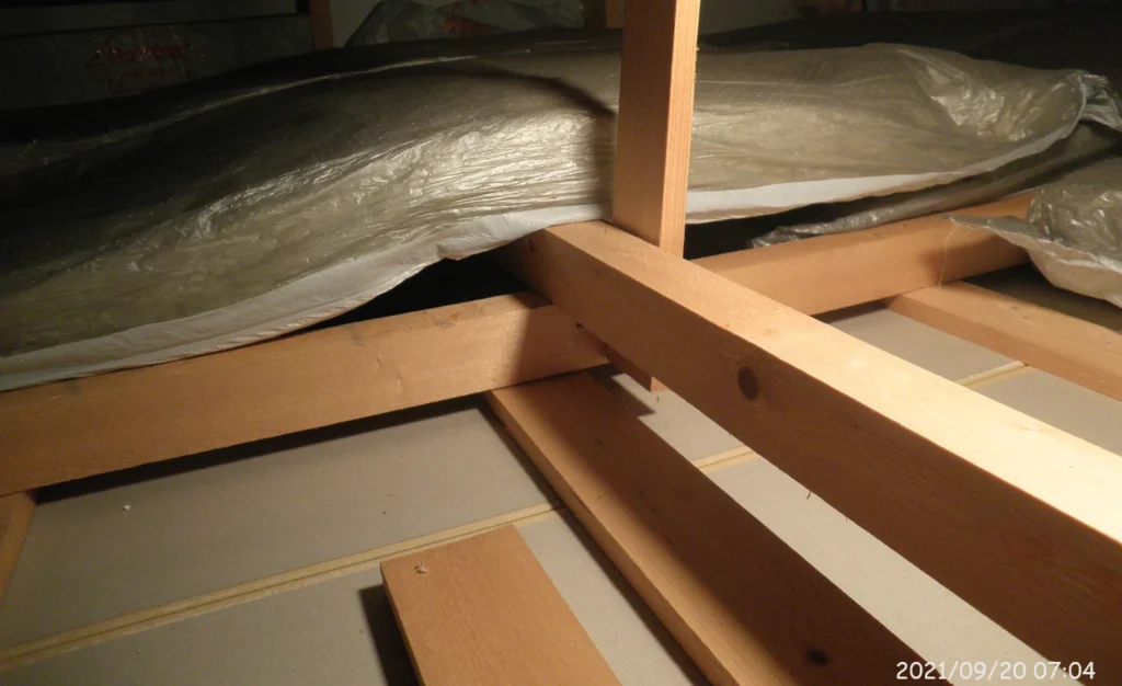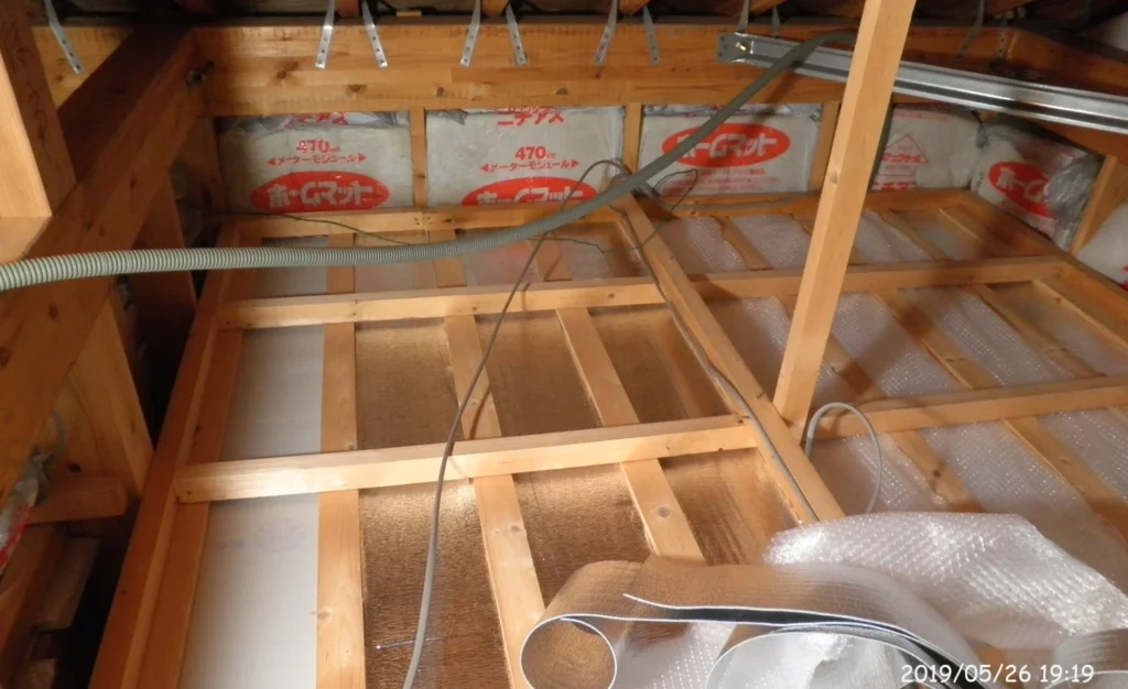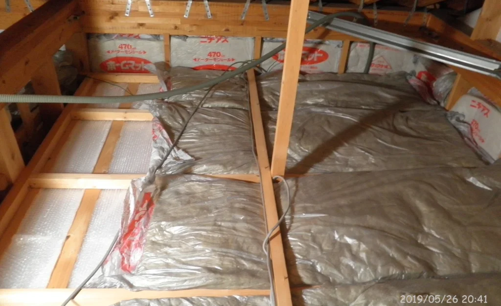 改修前の天井裏。石膏ボードの上に断熱材が適当に乗せられていた。石膏ボードは通気性があり、不燃性であるが、断熱性能はほとんど無い。石膏ボードが外気に接するため、断熱性能はあって無いようなものである。断熱シートを貼り付け、その上に「梱包用ツブツブシ-ト」を貼り付けた。