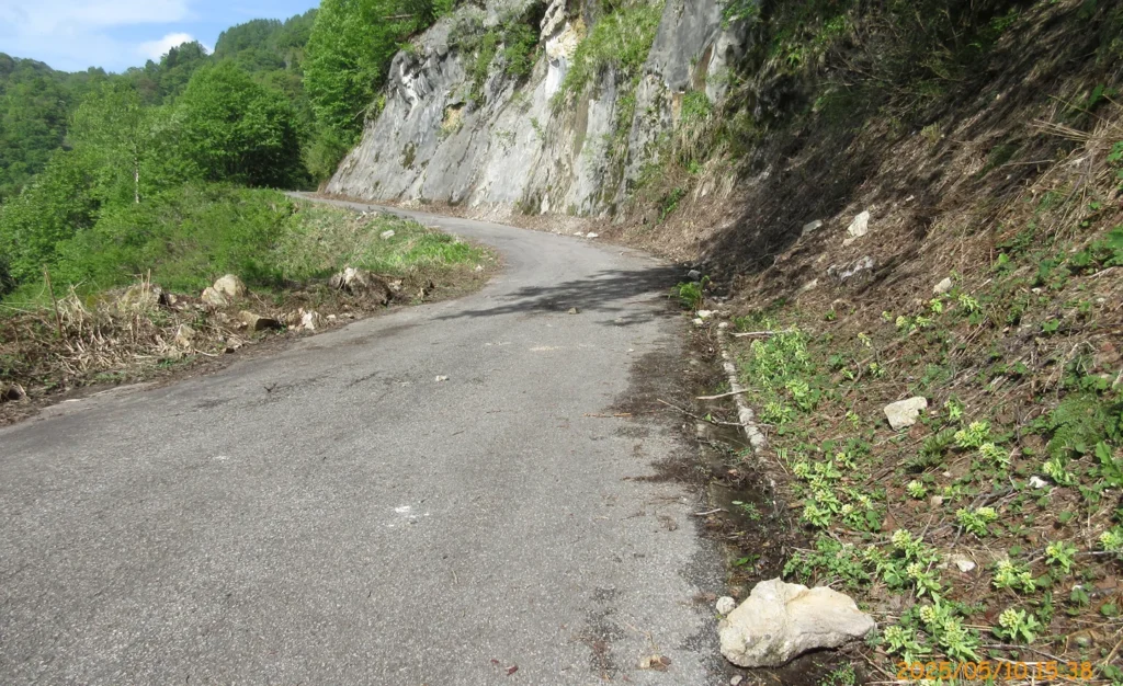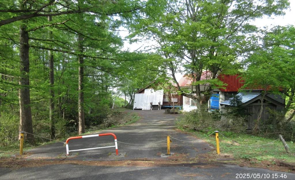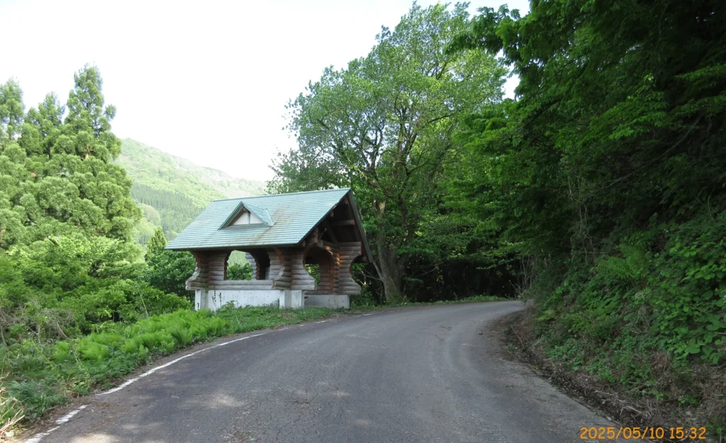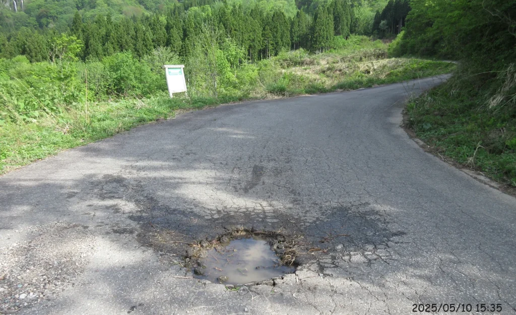 休憩小屋からさらに進むと、所々に穴があいた道路に入る。