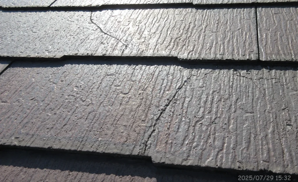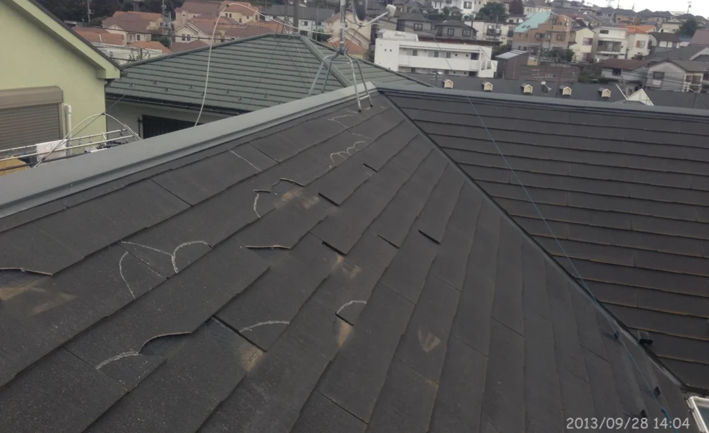 この家屋に施工されたのは「ノンアスベスト・スレート屋根」と思われる。