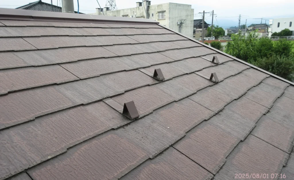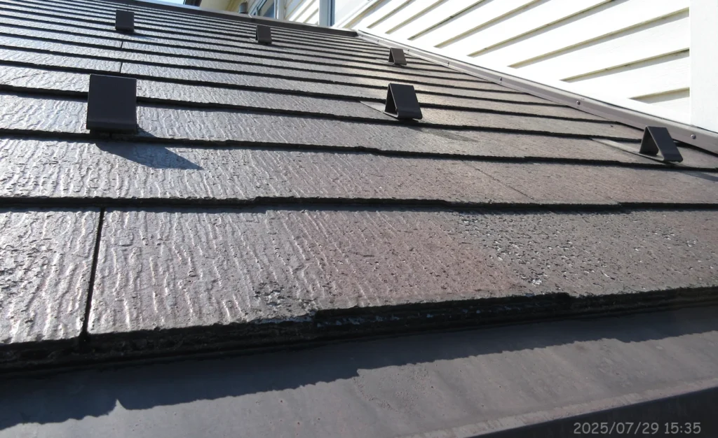 これは平屋部分の屋根を撮影したものである。この屋根は新築時(2007年)に取り付けられ、2017年に塗装された。このとき使用されたのは水性塗料で、色は「ナポリブラウン」。