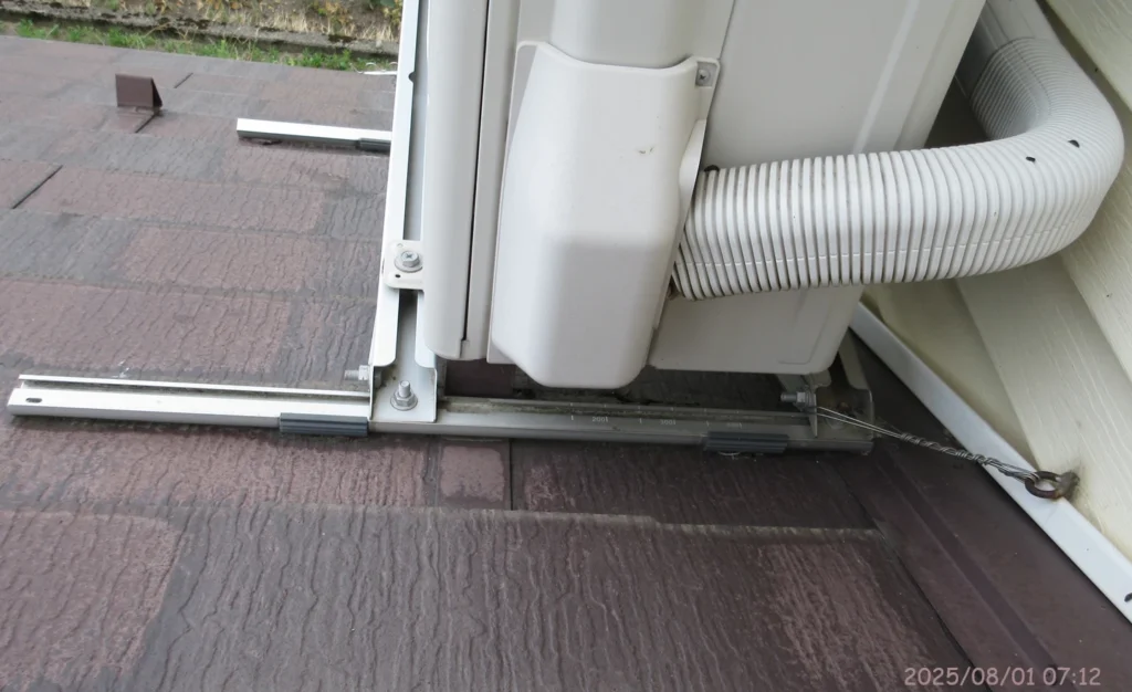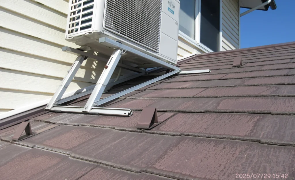 室外機を固定する金具が壁に取り付けられているが、特に異常は発生していないように見える。