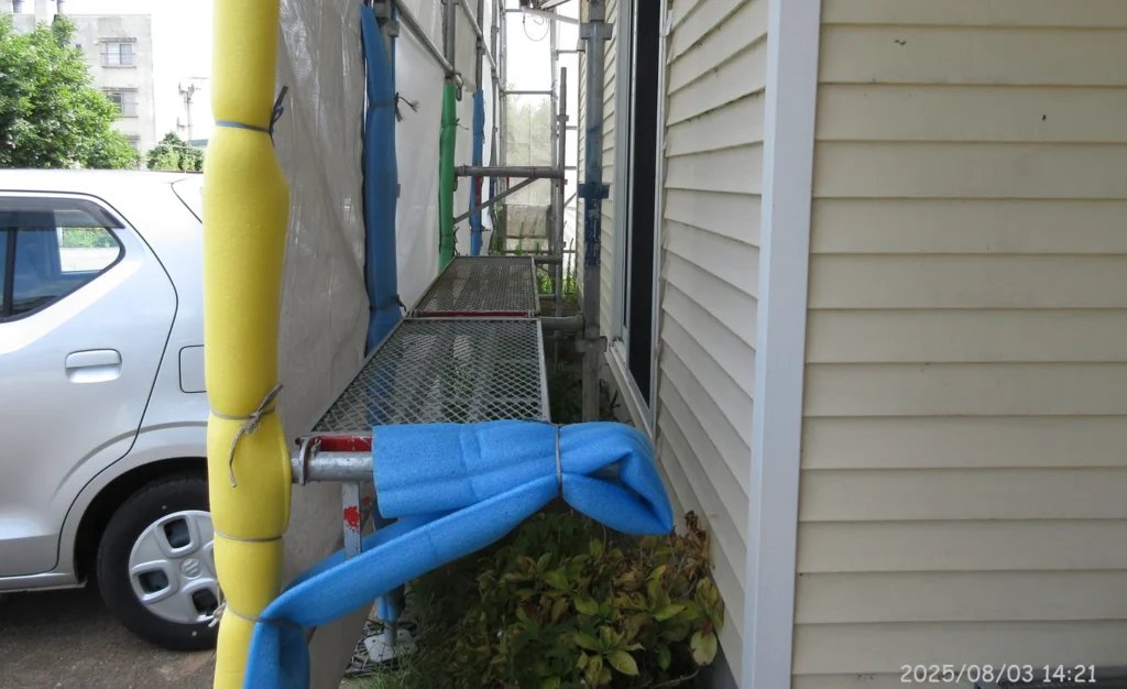足場の一部にはクッションが巻かれている。