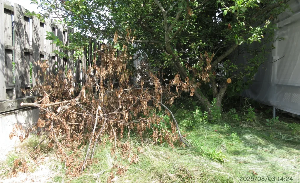 枝の処分については、猛暑の時期が終わってからにする。