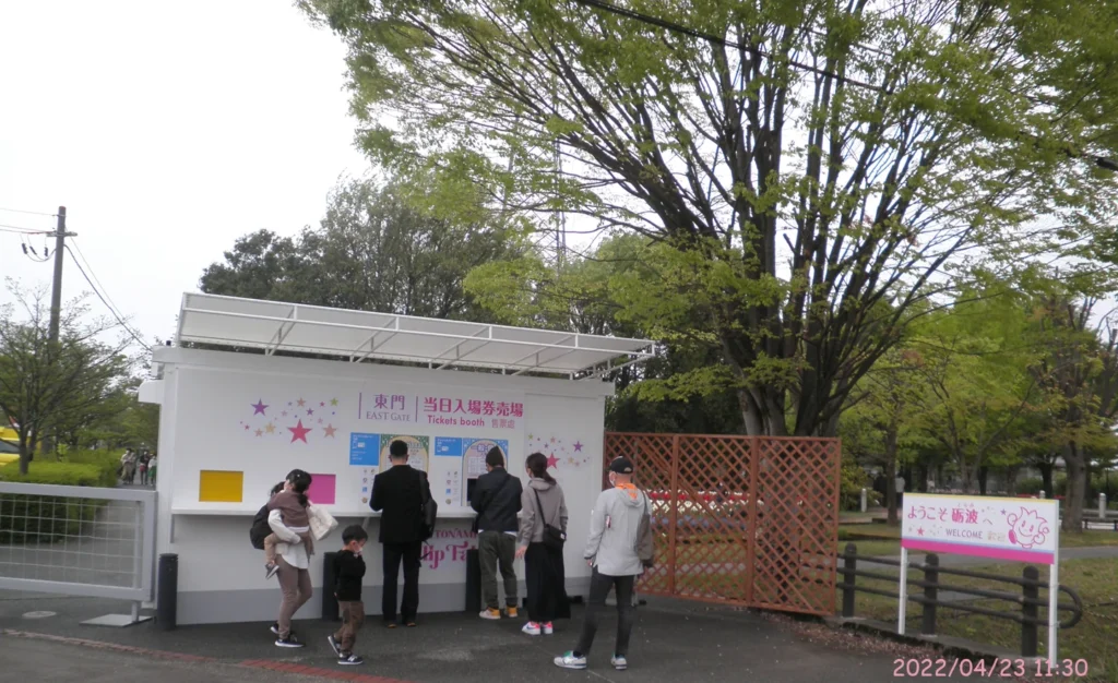 「砺波チューリップフェア2022」会場入り口付近。現地には広い駐車場を備えているが、チューリップフェア期間中は指定された臨時駐車場を利用して、そこから徒歩で会場に向かうことになる。前売り券を持っていない人は、「当日入場券売り場」で当日券を購入し、ゲートから入場する。