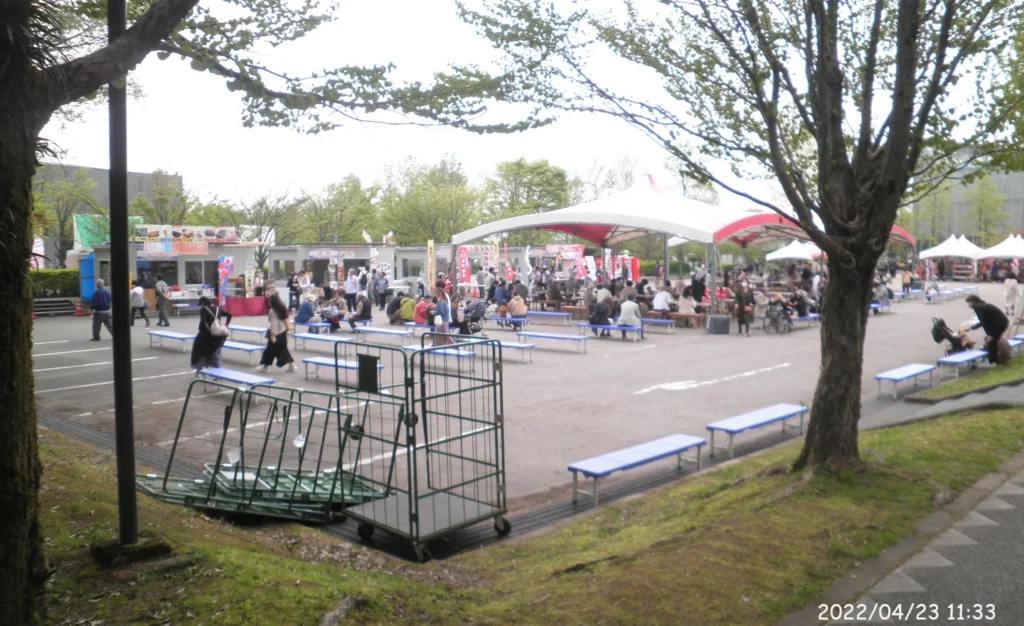 奥には屋台が立ち並び、手前には飲食スペースがある。
