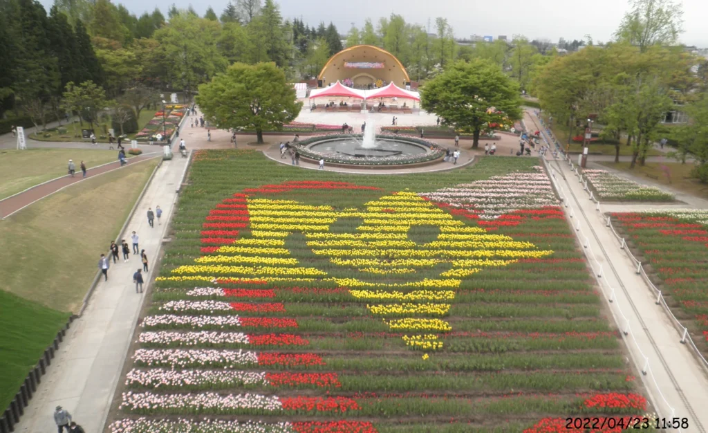 コロナ渦が猛威を振るった2020年、チューリップフェアは中止となり、公園内も封鎖されたが、この場所には絵文字が描かれていた。