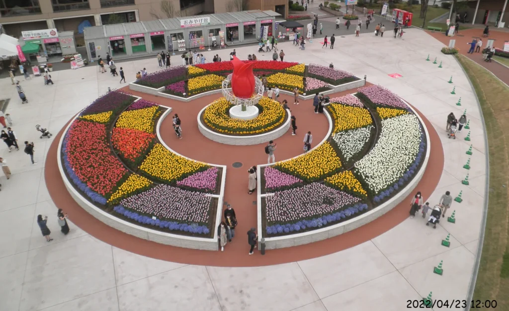「円形花壇」には、青紫色の花も植えられているが、すべてチューリップである。