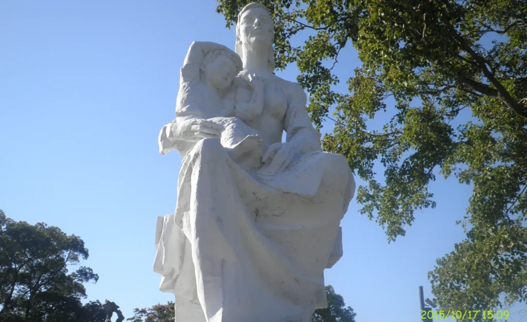 原爆の恐ろしさを訴えるために建造された銅像です。額に描かれている「点」はブッダの額を表現しています。胸に刻まれている十文字の模様はキリストの十字架を表現しています。